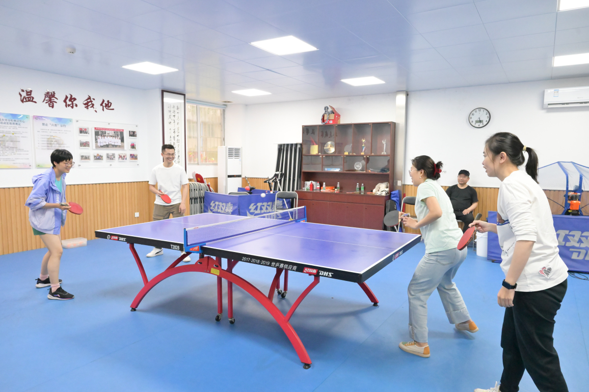 培训班的首次活动安排在2023年3月22日下午进行。活动时间一到,中心的工会活动室一派热闹景象,参加培训的老师在球台前你一拍我一板地练习起来。中心主任顾凤龙教授也来到了现场,与老师们亲切地交谈,与大家一起切磋。工会体育委员刘锦辉老师组织大家轮流练球,曾老师在球台旁,查看、了解每位老师的基础、动作特点,为每位老师单独地指导招式、动作。一时间,活动室围满了人,大家都跃跃欲试。白色小球在球网飞舞穿梭,球台两端的老师们争相试验自己新学到的技术,球室中充满了乒乒乓乓的击球声和欢声笑语。大家轮番上场,体验乒乓球运动带来的快乐!