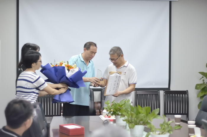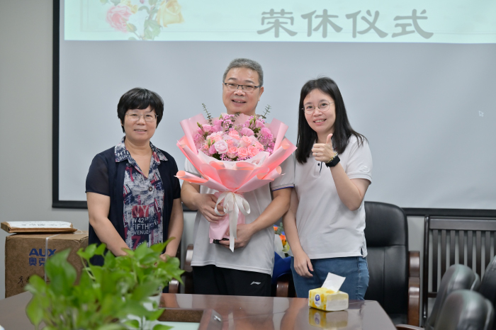 随后,顾凤龙向吴育槐赠送了鲜花与荣休纪念品。荣休仪式后,老师们争相与吴育槐合影,留下美好而珍贵的纪念。