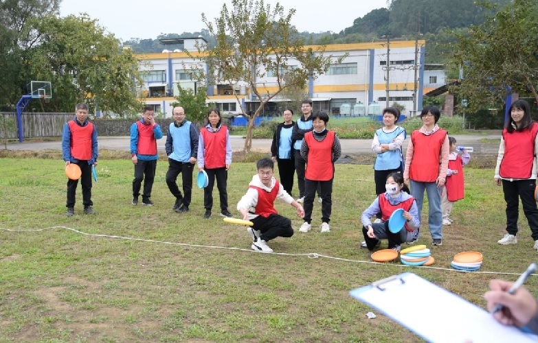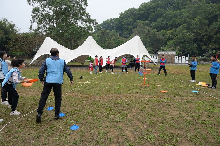 上午9点30分许,天气正好,活动正式拉开帷幕。团建教练带领老师们热身后,引导大家分为红蓝两个队。在两队设计好自己的队名及口号,风采展示过后,团建活动随即展开。第一部分是飞盘嘉年华。两队在教练的指导下,使用一定数量的飞盘打靶,击中分值不同的靶标以获得对应的积分。比赛开始了,只见场地上红蓝两色的身影左右腾挪,五颜六色的飞盘伴随着老师们的欢笑声,争先恐后地飞向空中,场面热闹非凡。飞盘大赛红队以微弱优势领先。