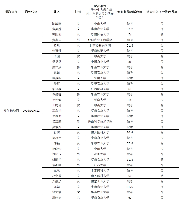 我单位2024年公开招聘预聘制人员1名,其中教学辅助岗位2024YPZFX12已于2024年5月10日完成专业技能测试,现将专业技能测试成绩公布如下: