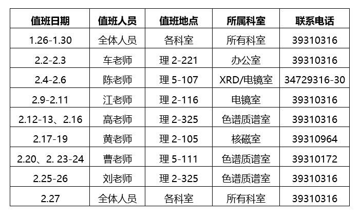 为保障寒假期间各单位及师生科研工作的顺利开展,确保实验室安全,根据学校《关于2026年放寒假的通知》(华师办〔2026〕1号),分析测试中心结合实际情况为师生们提供服务。具体值班安排如下: