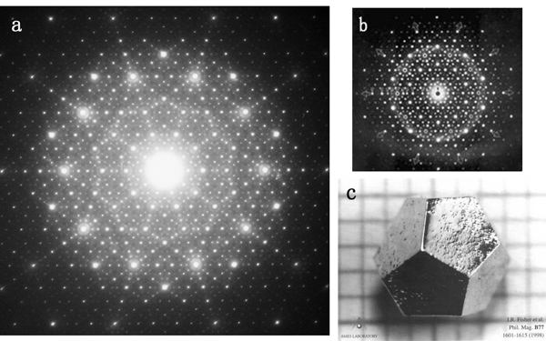 准晶是准周期晶体的简称,它是一种无平移周期性但有位置序的晶体;也有人将其定义为具有非公度周期平移对称的晶体。准晶可以具有一般晶体禁止出现的五次、八次、十次和十二次旋转对称,但非公度周期平移对称才是其本质特点。下图中为准晶的电子衍射花样和三维准晶的外形,其中图a是二维Al-Ni-Co十次准晶的电子衍射花样,图b是三维准晶沿5次对称轴得到的电子衍射花样,图c为三维准晶的外形。从电子衍射花样可以清楚地看到准晶的非周期平移对称特点。衍射花样中,衍射斑点之间虽然不满足平移对称,但它们之间满足数学上的菲博纳奇数列。