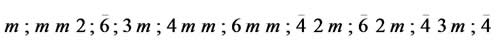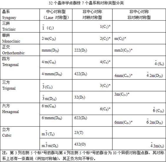 将以上点对称操作任意组合,能够构成群的组合有32种,这就是晶体中能够存在的点对称操作组合,称之为晶体学点群。所以晶体中能够存在的点群是32种。