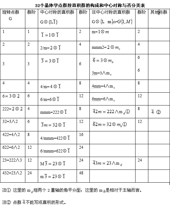 下表是32种点群按直积群的构成和中心对称与否的分类表: