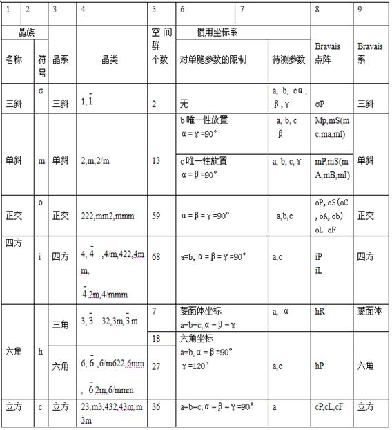 三斜;单斜;正交;四方;菱面体;六角;立方。(如下表所示)