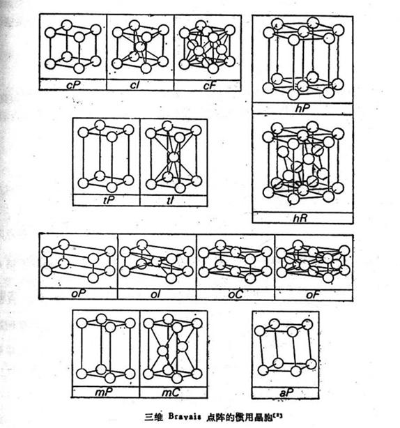 当选用能充分反映点群对称性的惯用晶胞时,可以得到14种bravais点阵,分别是简单立方(cP)、体心立方(cI)、面心立方(cF)、简单四方(tP)、体心四方(tI)、简单正交(oP)、体心正交(oI)、面心正交(oF)、侧心正交(oA,oB或者oC)、简单单斜(mP)、侧心单斜(mA,mB或者mC)、简单三斜(aP)、简单六方(hP)、菱面体六方(hR)。如下图所示: