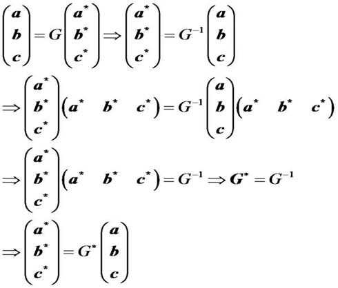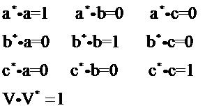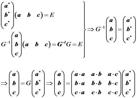 由倒易矢量的定义可以知道,倒空间中的三个基矢其实是正空间中与正空间基矢共原点的三个矢量,因此可以用空间变换将两组基矢联系起来,从而将正、倒空间的矢量计算结合起来。