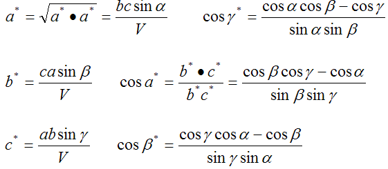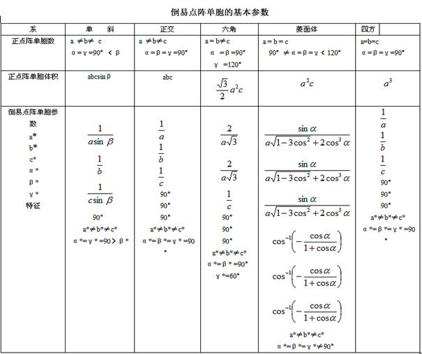 由上面这些矩阵,用类似于求三斜晶系倒空间晶格常数的办法,可以求出其它所有晶系的晶格常数的表达式,下表即是各大晶系倒易点阵单胞的基本参数表: