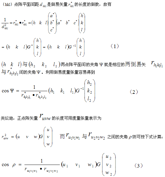 利用度量张量的概念,可以非常方便地求出晶体中的晶面间距、晶面之间的夹角、晶向长度和晶向之间的夹角。