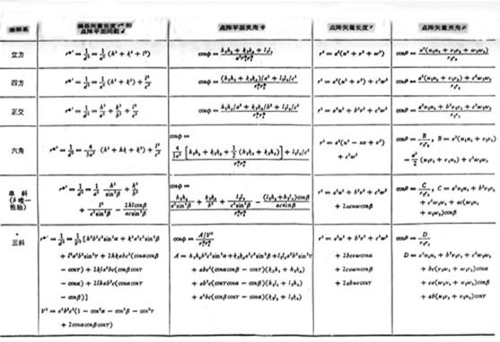 各晶系的晶面间距、晶面之间的夹角、晶向长度和晶向之间的夹角如下表所示: