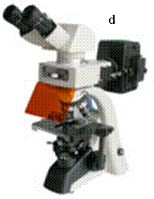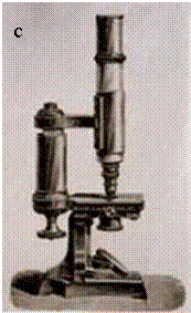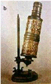 a) 第一台复式显微镜;b)列文.虎克显微镜;c)十九世纪的显微镜;d)现在的显微镜