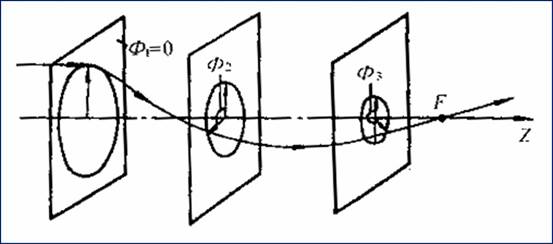 根据上面的受力情况,可以知道电子束在通过电磁透镜时的运动方式,如下图所示: