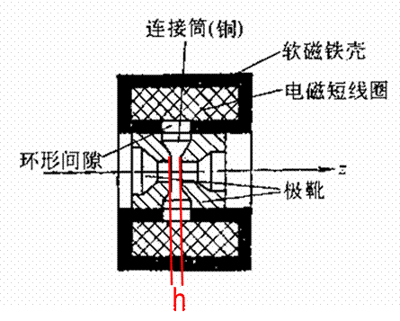下图是实际的电磁透镜示意图,实际的电磁透镜都会包上一层软磁铁壳,而且现在的电磁透镜都会有一个非常重要的部件 ——极靴。有极靴的透镜中,极靴使得磁场被聚焦在极靴上下的间隔h内,h可以非常小。在如此小的区域内,磁场强度得到加强,透镜的球差也大大减小,所以现在要求较高的电磁透镜,极靴之间的距离都非常小,比如现在的高分辨电镜,其物镜的极靴的距离一般都因为太小,所以不允许有太大的倾转角。