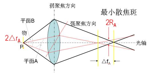 这种非旋转对称磁场会使它在不同方向上的聚焦能力出现差别,结果使成像物点P通过透镜后不能在像平面上聚焦成一点,形成一个最小散焦斑,这个最小散焦斑半径的大小可以表示成: ![]()