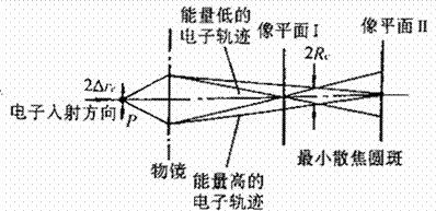色差是由于入射电子波长(或能量)不同造成的。由于色差引起的散焦斑半径折算到原物平面后的表达式为: