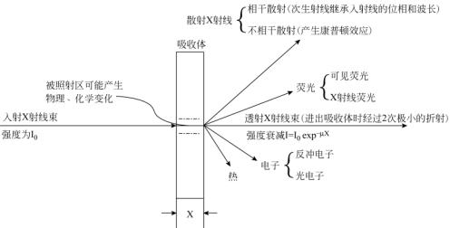 X射线穿透物质时都会被部分吸收,其强度将被衰减变弱;吸收的程度与物质的组成、密度和厚度有关。在此过程中X射线与物质的相互作用是很复杂的,会引起多种效应,产生多种物理、化学过程。例如,它可以使气体电离;使一些物质发出可见的荧光;能破坏物质的化学键,引起化学分解,也能促使新键的形成,促进物质的合成;作用于生物细胞组织,还会导致生理效应,使新陈代谢发生变化甚至造成辐射损伤。然而,就X射线与物质之间的物理作用而言,可以分为两类:入射线被电子散射的过程以及入射线能量被原子吸收的过程。