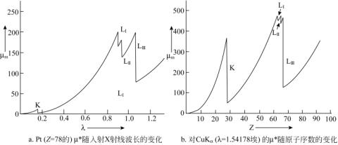 元素的吸收系数是入射线的波长和吸收元素原子序数的函数。如图1.8a所示,对于一种元素其质量吸收系数μm随着波长的变化有若干突变,发生突变的波长称为吸收限(或称吸收边)。在各个吸收限之间质量吸收系数随波长增加而增大。所以短波长的X射线(所谓硬X射线)穿透能力大,而长波长的X射线(所谓软X射线)则容易被物质吸收。对于X射线的实验技术来说,最有用的是第一吸收限,即K吸收限。质量吸收系数随着波长的变化有突变的原因,也就是元素特征光谱产生的原因。当入射X射线的能量足够把内层电子轰出时(即光电效应),能量便被吸收,并会部分转化为元素二次辐射的能量。各个吸收限之间的区域内质量吸收系数符合下面的近似关系: