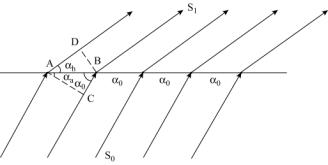 首先考虑一行周期为a0的原子列对入射X射线的衍射。如图1.10所示(忽略原子的大小),当入射角为α0时,在αh角处观测散射线的叠加强度。相距为a0的两个原子散射的X射线光程差为a0(cosαh - cosα0),当光程差为零或等于波长的整数倍时,散射波的波峰和波谷分别互相叠加而强度达到极大值。光程差为零时,干涉最强,此时入射角a0等于出射角,衍射称为零级衍射。