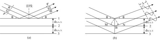 晶体的空间点阵可划分为一族平行且等间距的平面点阵(hkl),或者称晶面。同一晶体不同指标的晶面在空间的取向不同,晶面间距d(hkl)也不同。设有一组晶面,间距为d(hkl),一束平行X射线射到该晶面族上,入射角为θ。对于每一个晶面散射波的最大干涉强度的条件应该是:入射角和散射角的大小相等,且入射线、散射线和平面法线三者在同一平面内(类似镜面对可见光的反射条件),如图1.11a所示,因为在此条件下光程都是一样的,图中入射线s0在P,Q,R处的相位相同,而散射线s在P’,Q’,R’处仍是同相,这是产生衍射的必要条件。