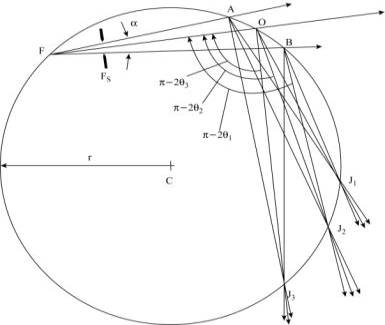 聚焦光束型的多晶衍射仪器采用了晶体衍射的聚焦原理。聚焦原理示意说明在图2.3中:设在半径为r的圆C的圆周F点上,有一个仅在该圆平面上发散的X射线点光源;X射线受发散狭缝Fs的限制,以发散角α沿FO方向射出;样品粉末置于该圆周上的受照射区—弧段AB上。如此,在弧段AB中的任一点上能发生衍射的同一晶面族的衍射线,因为衍射角都是相同的,所以都应汇聚在该圆周上的同一点J上,不同晶面族的衍射线则分别聚焦于该圆周上不同的点上。(例如,图2.3中衍射角为θ1,θ2,θ3…的各衍射线分别汇聚在J1,J2,J3…等点上。)该圆称为聚焦圆。