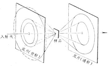 照相法采用感光底片来检测衍射线的方向和强度。有多种各具特点的衍射照相机,它们的区别在于所采用的衍射几何的不同以及感光软片的安放相对于样品的几何关系的不同。历史最悠久的粉末照相机(Debye-Scherrer照相机)和各种平板照相机,均属平行光束型,前者软片作圆柱面状安放,样品处于柱面的轴上,X射线垂直柱面轴线射到样品上(图2.4),而后者软片作平面式安放,垂直于入射线,位于样品与射线源之间(背射式)或位于入射线穿透样品之后的光路上(透射式)(图2.5)。