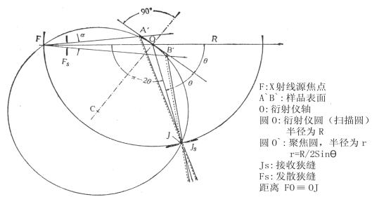 当入射线与样品的夹角θ自0°附近开始增加时,如果有衍射产生,聚焦点J应自FO的延线上的P点(OP = R = OF,此位置2θ = 0°)附近开始,沿以O为中心、R为半径的圆周运动,而弧线段AB也以O为轴转动,并改变着曲率,且OJ与弧线段AB在O点的切线段A'B'的夹角恒为θ,所以OJ转过的角度即为2θ。因此,在测角仪中,只需检测器与样品以同一转轴O转动,样品平面与O轴重合,并要求OJ≡R≡OF,且当样品表面转过θ角时,检测器转过2θ角,即检测器与样品表面角位移之比为2:1,则能保证样品表面在任意的θ位置时OJ与样品表面(A'B')间的夹角也为θ,如此便能保持上述的近似聚焦条件。2θ可以根据检测器转过的角度直接读出。