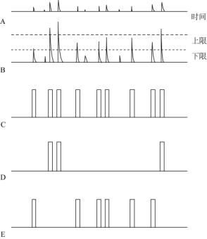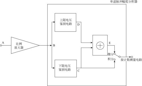 脉冲幅度分析器的工作原理图解如图3.5b:设在某一段时间里,有幅值约几十毫伏的随机脉冲信号序列自检测器输入(A点),这些脉冲信号的幅值和时间间隔都是不规则的,经过幅度比例放大后,它们的幅度放大到2~3伏左右(B点)。幅度低于下限鉴别器触发电平的脉冲信号对上、下限两个鉴别器都无法驱动;幅度高于下限而低于上限鉴别器触发电平的脉冲信号只能驱动下限鉴别器;幅度高于上限鉴别器触发电平的脉冲信号则能同时驱动上、下限鉴别器(请比较C、D两点的脉冲数的差异并联系每个输入脉冲的幅度)。而对于异或门,只有当仅有一个输入端有输入时才有信号输出,所以在输出端E点,只有其幅值在上限与下限触发电平之间的脉冲信号才能引起输出。因此,在E点进行计数测量时,得到的将仅是幅度在“窗”内(即“道宽”内)的脉冲信号的个数,也就是说,当确定阈值和道宽后,只有某种波长的X射线产生的信号才能通过脉冲幅度分析器。