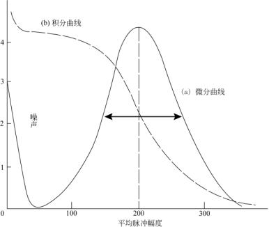 对于强度恒定的射线,只规定下限而上限不加限制(即道宽无限大)进行脉冲计数的测量,称为积分测量。当下限值自零附近开始逐步增加,此时可以进行积分测量,得到讯号幅度大小的一种分布曲线,称积分分布曲线。当用一个很小的道宽(例如用最大阈值的1/100),而下限值自零附近开始逐步增加,此时进行的脉冲计数测量叫做微分测量或脉冲幅度分析或能谱分析,所得到的讯号幅度大小的分布曲线称微分分布曲线或能谱曲线。下图示出了用SC测得的CuKα的积分曲线和能谱曲线。不同能量的X射线,其微分曲线的平均脉冲幅值与射线量子能量成正比(图1.13)